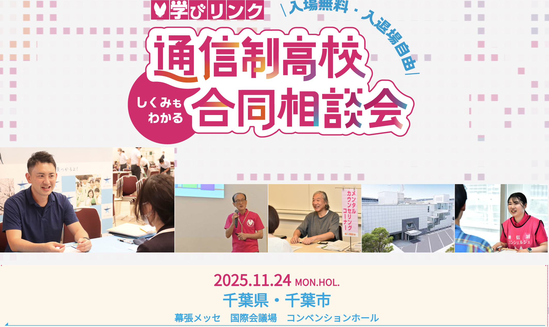 来る11月24日(月曜・祝日)幕張メッセは、JR京葉線 『海浜幕張駅』から徒歩約5分 (東京から快速利用で約30分)のところにあります『国際会議場 コンベンションホール』で通信制高校が集まる合同相談会が開催されます。