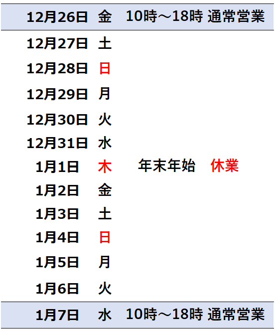 年明け(2026年)は1月7日(水)から通常営業となります。